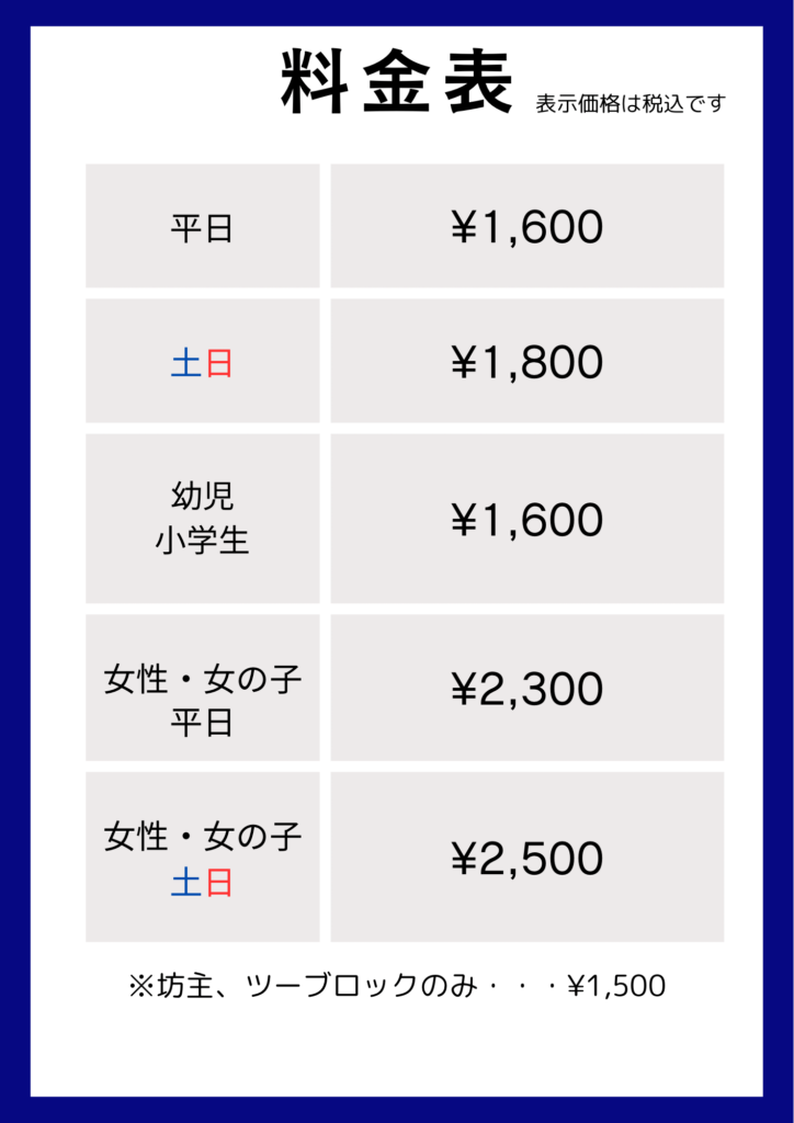 - ワックスやジェル等の整髪料でセットされている場合や、衛生上施術が難しいと判断した場合は、カットをお断りさせていただく事があります。